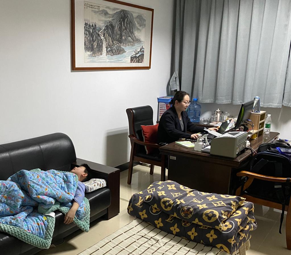“我是党员,关键时候必须起带头作用,我不是一个人在战斗,这点辛苦不算什么,只是做了应该做的工作而已”,正在维持核酸检测现场秩序的食品与生物工程学院党总支副书记赵蓓说。3月16日,她带着这样的信念,排除困难将4岁的小女儿安置到了姥姥家,带着11岁小学五年级的儿子来到学校,她让儿子晚上睡在办公室里的一张办公沙发上,给自己准备了一张行军床,开始了为期半月的驻校办公生活。