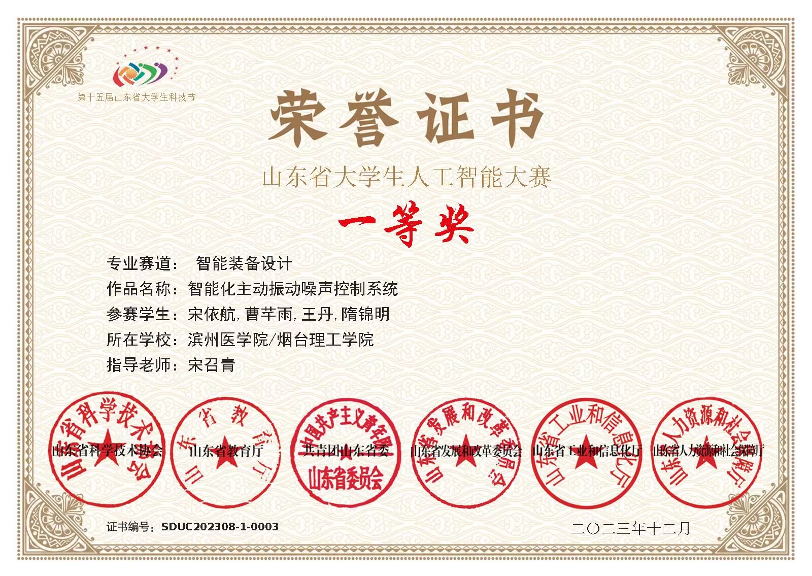 近日,第十五届山东省大学生科技节第六届山东省大学生人工智能大赛——智能装备设计赛在山东省乐陵市落下帷幕。由宋召青老师指导,人工智能学院学子曹芊雨、王丹等同学的作品“智能化主动振动噪声控制系统”在比赛中斩获佳绩,斩获一等奖。