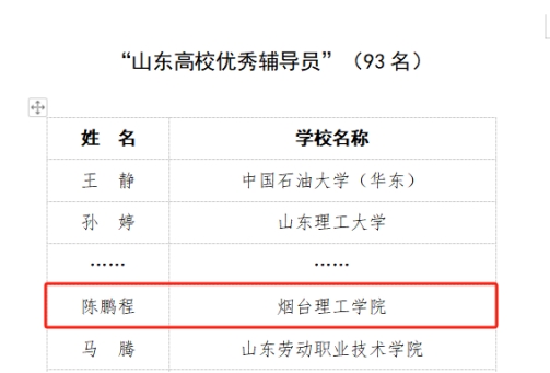 日前,中共山东省委教育工作委员会发布《关于组织开展2023年“山东学校思政课教师年度人物”“山东高校辅导员年度人物”宣传选树工作的通知》中,我校辅导员陈鹏程经层层选拔,脱颖而出,获评“山东高校优秀辅导员”称号。