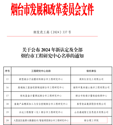 近日,烟台市发展和改革委员会发布了《关于公布2024年新认定及全部烟台市工程研究中心名单的通知》(烟发改工高[2024]337号),我校信息工程学院申报的“大型园区能源大数据技术烟台市工程研究中心”、人工智能学院申报的“智能视觉烟台市工程研究中心”2个中心获批立项建设。获批数量位居全市前列。