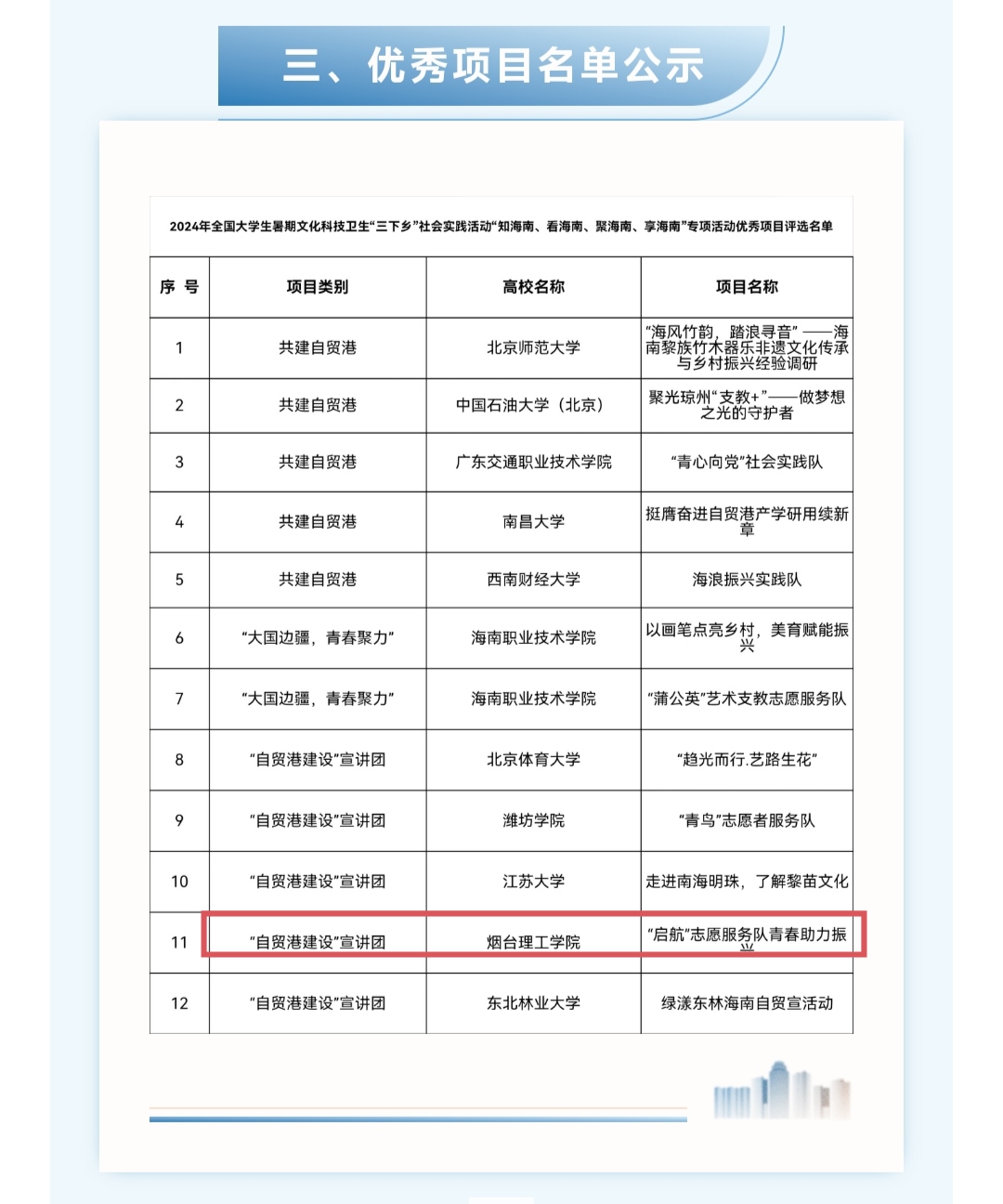 为激励青年大学生在基层一线的生动实践中受教育、长才干、作贡献,充分发挥青年大学生团员的生力军、先锋队作用,共青团海南省委、海南大学于2024年暑期开展的2024年全国大学生暑期文化科技卫生“三下乡”社会实践“知海南、看海南、聚海南、享海南”专项活动,得到全国各地高校师生的广泛关注。人工智能学院两支队伍参与专项,最终“启航”志愿服务队荣获专项活动优秀项目荣誉。