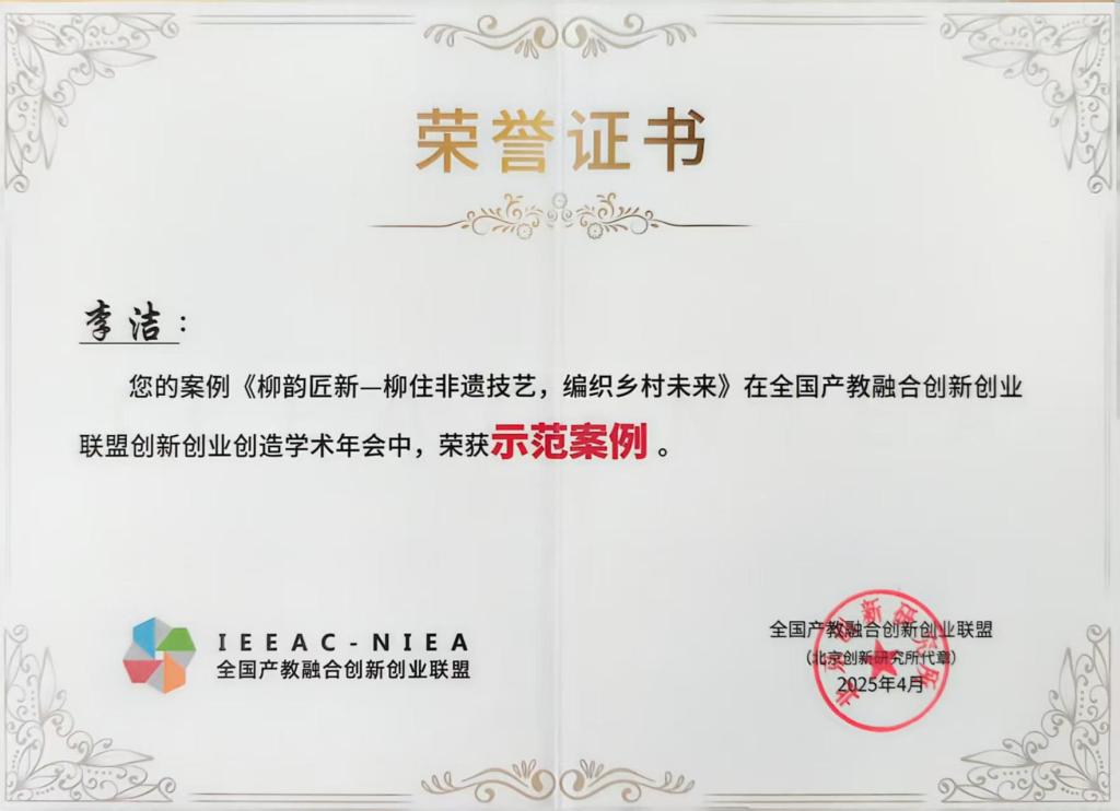 本次会议中,校长助理李洁负责的“柳韵匠新—柳住非遗技艺,编织乡村未来”项目获全国产教联盟创新创业创造学术年会示范案例奖。该项目以传承非遗柳编技艺为核心,创新性地采用“互联网+非遗”模式,整合“网红手艺人+直播电商+在线教育”多重资源,为乡村振兴注入新动力。项目联合政府、企业与高校多方力量,构建起产业“内外双循环”体系,开发200余种编织技法教学课程,录制超过2600节视频,播放量突破亿次,带动产品销量超5.5万件,惠及数万人。该项目不仅为乡村振兴提供了可复制的“非遗+电商”模式,更为传统文化的活态传承开辟了创新路径,成果引发广泛关注与高度赞誉。