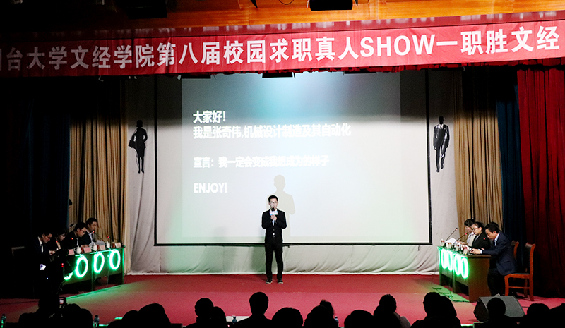 11月2日晚,学院第八届校园求职真人show“职胜文经”在一教207多功能厅举行。院长助理杜希成、史毅,各系及职能部门负责人出席活动。由山东鼎信网络科技公司、中裕食品有限公司、烟台林业纺织印染有限责任公司、山东景建股份有限公司、新希望六和股份有限公司、蓝月亮(中国)有限公司、烟台链家地产经纪有限公司、荣华建设集团有限公司八家公司组成的BOSS团前来招聘。