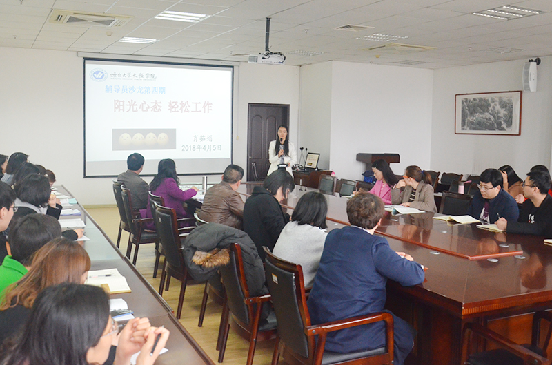 为提高辅导员的自我情绪管理能力,以轻松愉快的态度投入到工作和学习,4月5日,学工部在二教六楼会议室举办“阳光心态,轻松工作”主题辅导员沙龙活动。学工部教师肖茹娟担任主讲。院长助理杜希成、学工部部长张琼玉及全体辅导员参加活动。学工部部长张琼玉主持活动。