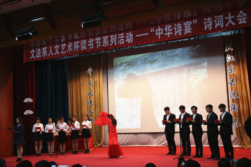 4月20日晚,文法系2017人文艺术杯“鸿儒硕学,案牍留香”读书节系列活动之“中华诗宴”诗词大会于一教多功能厅举行。院长助理杜希成、史毅,文法系主任汤唯、党支部书记王淑霞、副书记曹钊庆,以及相关职能部门负责人到场观看。中文专业教师于年湖、林莎、张吉山、刘芳担任大赛评委。