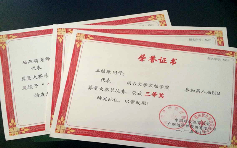 2015年全国高等院校第八届BIM算量大赛成功落幕,我院建筑工程系代表队在此次比赛中取得“BIM算量大赛三等奖”的优异成绩。建筑工程系丛苏莉老师被授予“优秀指导教师”荣誉称号。