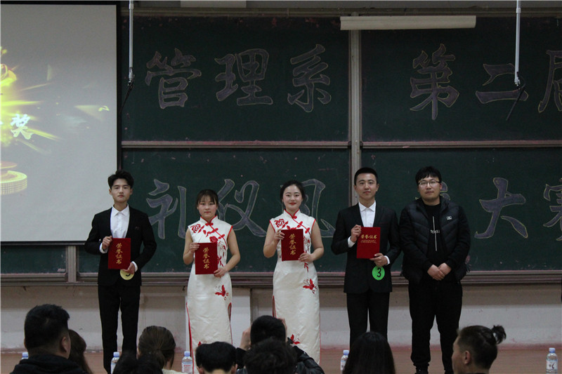 经过前期的预赛、复赛等环节,四支队伍脱颖而出。活动伊始,他们进行了各具风格的团队亮相,分别就源远流长的餐桌礼仪,丰富多彩的见面礼仪,神秘严肃的着装礼仪、庄重的会客礼仪进行讲解与具体行为展示。紧张激烈的团队答题环节,选手们胸有成竹,才思敏捷。才艺展示环节,“春风得意队”以幽默诙谐的方式讲述校园礼仪,“礼为情意队”朗诵《文明礼仪伴我行》,声情并茂,铿锵有力;“馫皛惢灥队”深情演唱《知否知否》,台下掌声雷动;文经第一颜值队带来古典舞《纸面书生》,文艺部的《红绍愿》舞姿翩翩,婀娜多姿。精彩激烈的比拼过后,“馫皛惢灥队”获一等奖,“礼为情貌队”获二等奖,“文经第一颜值队”获三等奖,“春风得意队”获优秀奖。罗公仆、郝洁、赵长斌三位同学获优秀个人奖。中国素有“礼仪之邦”的美誉,“礼仪大赛”活动,利用比赛晋级的模式,提高学生的参与意识和学习意识,弘扬中华民族的优秀传统文化,体现了管理系对文化教育的重视。
