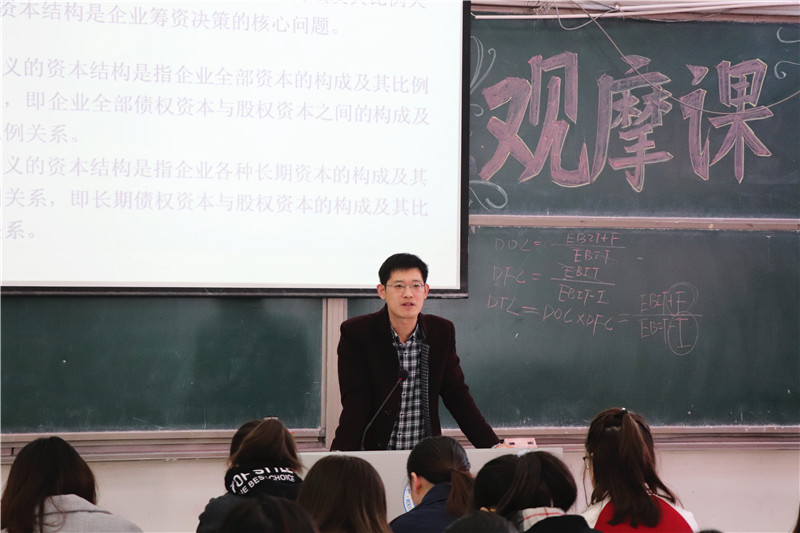 观摩课上,孔老师从资本结构决策等方面出发,对主要内容的讲解分出次序,划出大体框架结构,由表及里,由浅入深。孔老师根据课程特点,精心设计了图文并茂的PPT教学课件,课件内容条条分明,层层递进,在回顾上节课的内容的基础上逐步导入本节课的知识,从资本结构的价值,影响资本结构的因素等方面深入开展课程,并采用情境案例教学法,使学生真正融入课堂。在上课的过程中,孔老师和学生近距离互动,结合案例,通过提问和任务驱动的方式,使同学们在活跃的课堂气氛中掌握知识。教学环节设计紧凑,语言生动幽默,寓教于乐之中为学生带来了学习的动力,观摩课取得了良好的课堂教学效果。