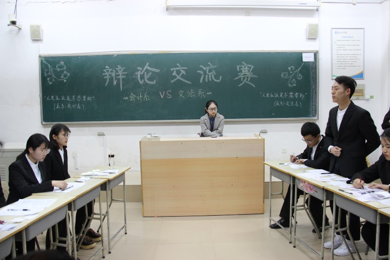 为增进会计系与文法系的友谊,促进两系友好交流的同时使同学们对社会问题及现象有更深层次的思考。3月16日晚,会计系、文法系于一教212教室举办了一场友谊辩论赛。