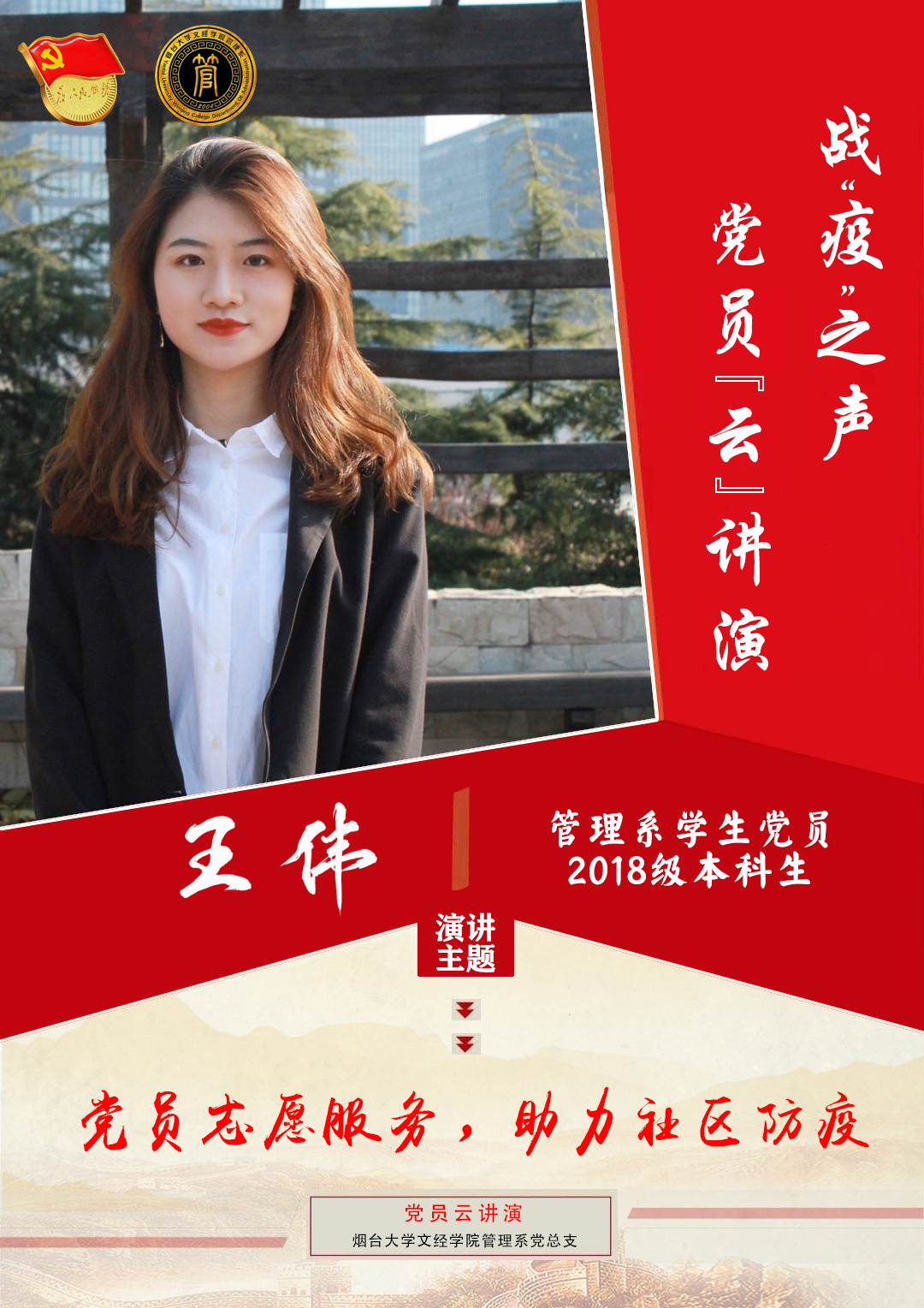 为深入贯彻习近平总书记关于新型冠状病毒感染的肺炎疫情防控工作的重要指示精神,积极响应党团组织号召,切实推进思想政治教育建设,烟台大学文经学院管理系于3月开始筹备并组织开展战“疫”之声——党员云讲演系列活动,依托新媒体平台构建党员演讲云课堂,创新思政教与模式。
