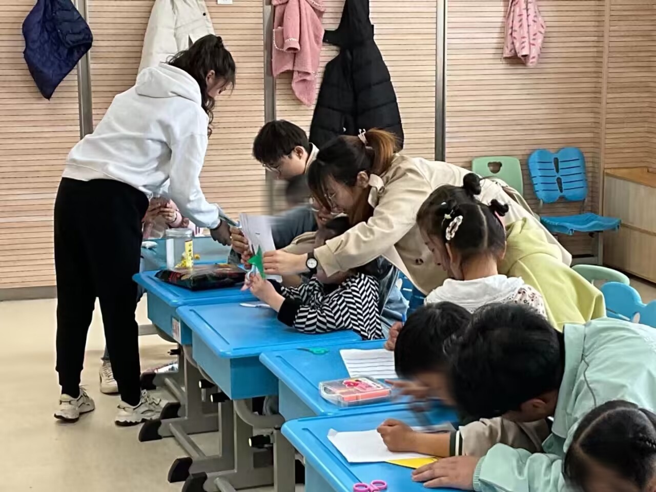 志愿者们送去各种文具和手工材料,在特殊学校老师的指导下,与孩子们肩并肩坐在一起上课,协助老师与孩子进行沟通、陪伴,一对一帮助孩子们完成课堂任务,鼓励他们打开心扉,主动参与学习。