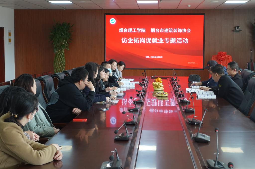 4月21日下午,建筑工程学院与烟台市建筑装饰协会进行访企拓岗促就业专题活动,建筑工程学院领导、老师,烟台市建筑装饰协会副会长王明明、负责人何峰出席本次活动。